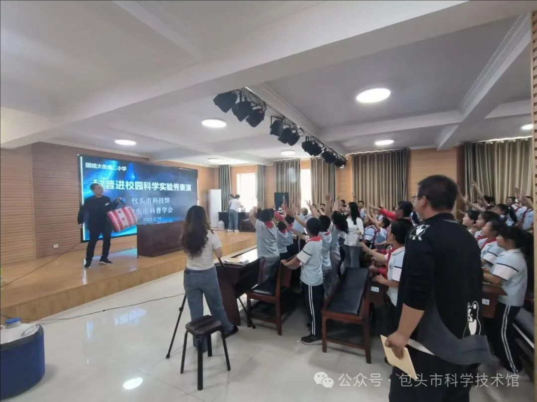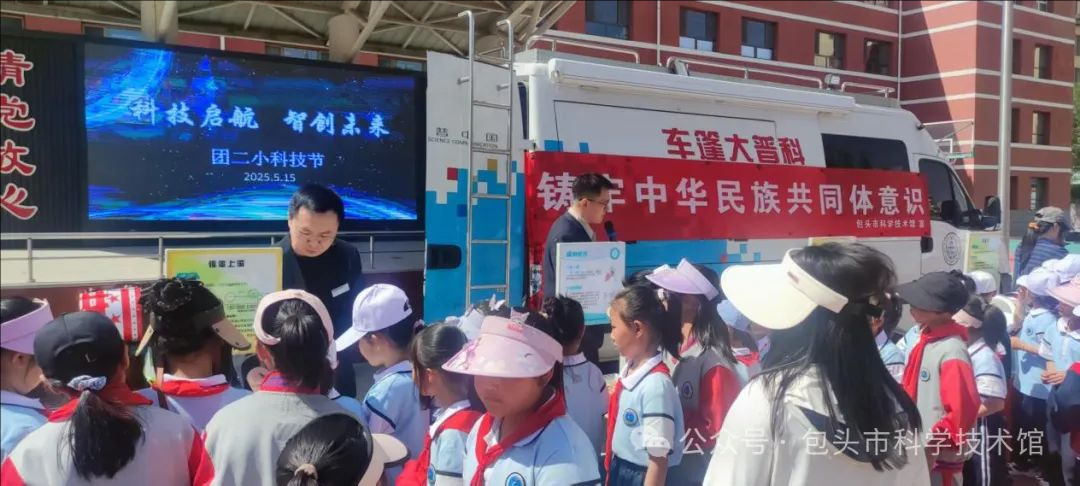 5月15日,市科技馆科普大篷车联合包头市科普学会走进团结大街第二小学,受邀参加团二小科技节开幕式,校园化身为“未来实验室”,科普大篷车满载“科技魔法”空降校园!机器狗跳起“机械舞”、机甲大师跑出“凌波微步”……全校师生在欢笑声与惊叹声中,开启了一场奇妙的科学之旅!