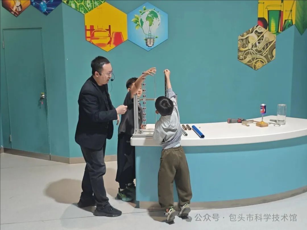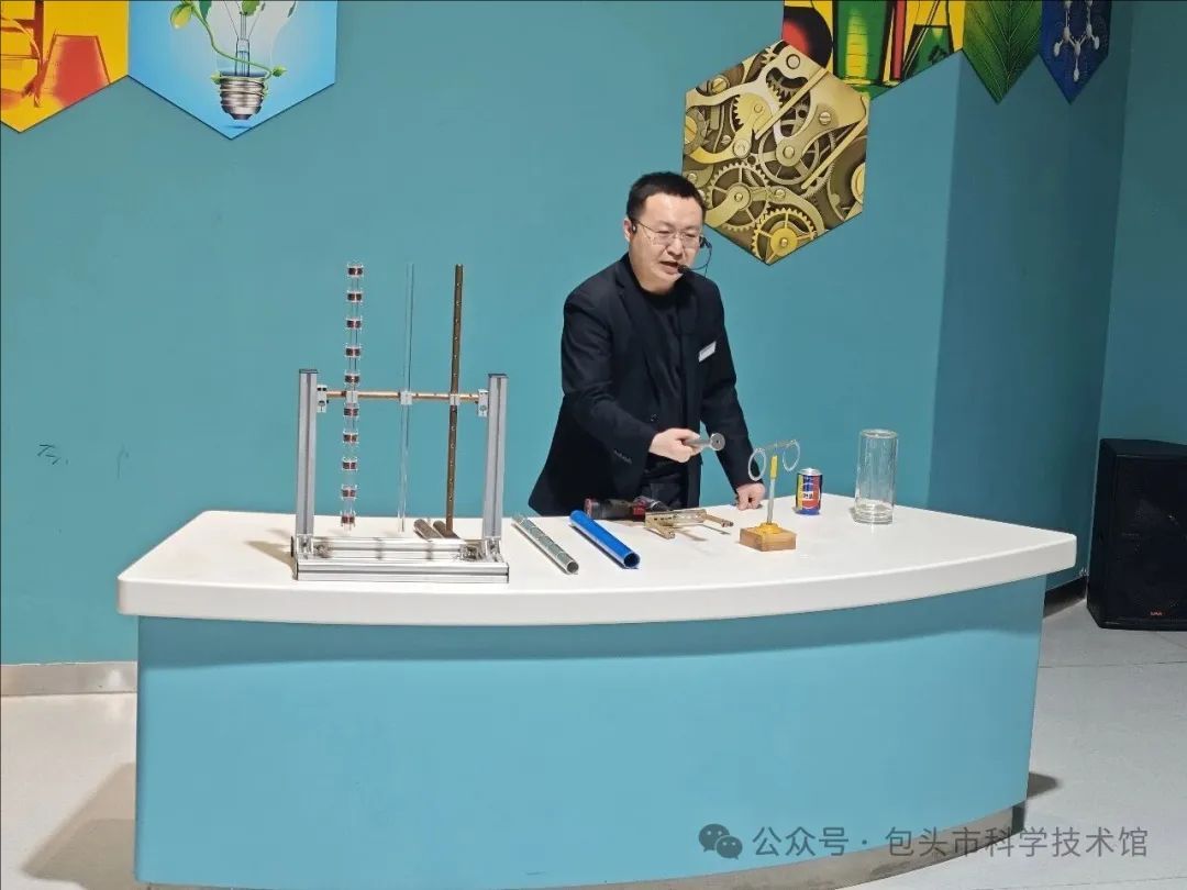 活动伊始,科普辅导员老师以趣味科学实验拉开序幕。小磁球穿过垂直铜管缓慢下落的奇妙现象,瞬间抓住全场观众注意力,自然引出探秘电磁的活动主题。