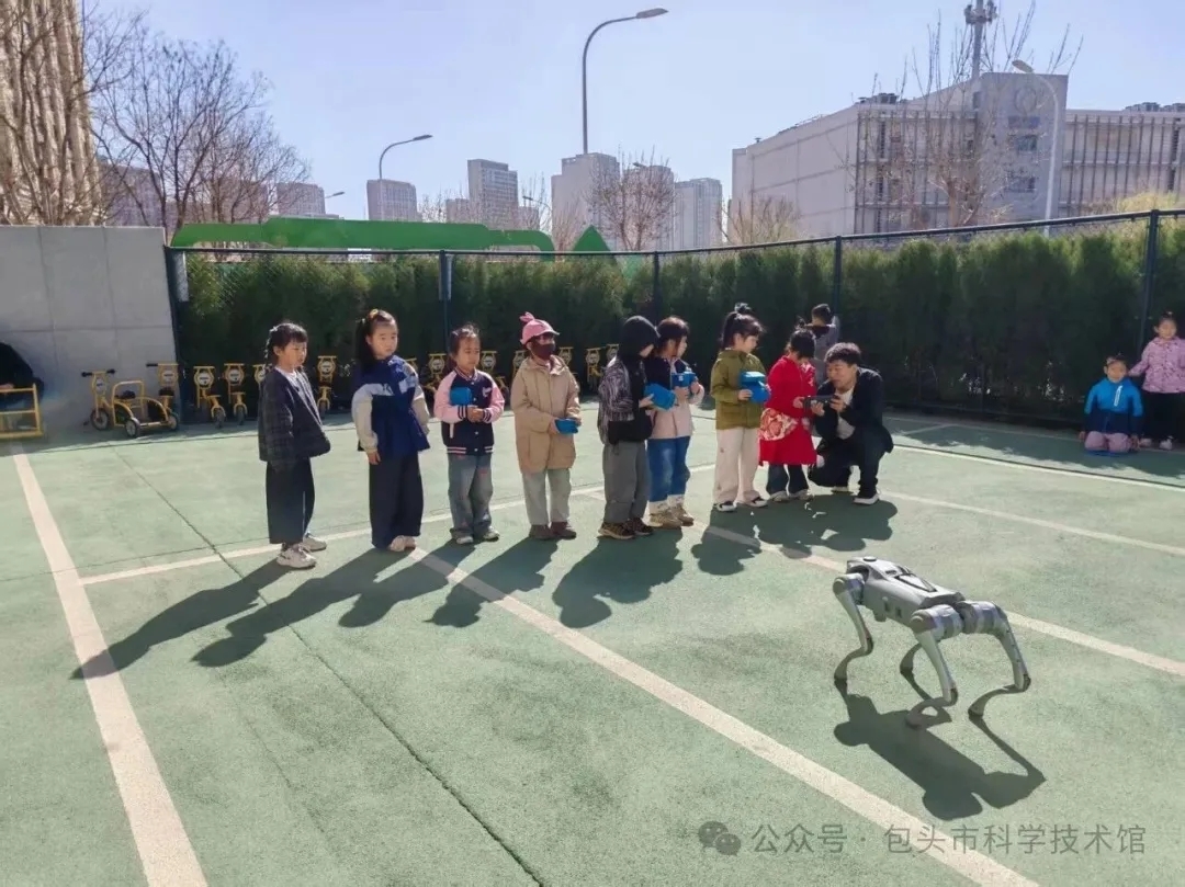 科学实验的余热未散,可爱的机器狗闪亮登场,将现场氛围推向高潮。灵活灵动的机器狗一出现,就牢牢抓住了孩子们的目光。伴随着欢快的音乐,机器狗精准完成转身、摇摆、跳舞等一系列憨态可掬的动作,还与小朋友们亲切互动。孩子们兴奋地围在四周,跟着机器狗的节奏拍手、欢呼,尽情感受现代科技带来的乐趣,欢声笑语回荡在幼儿园的每一个角落,近距离体验到了科技的趣味与神奇。