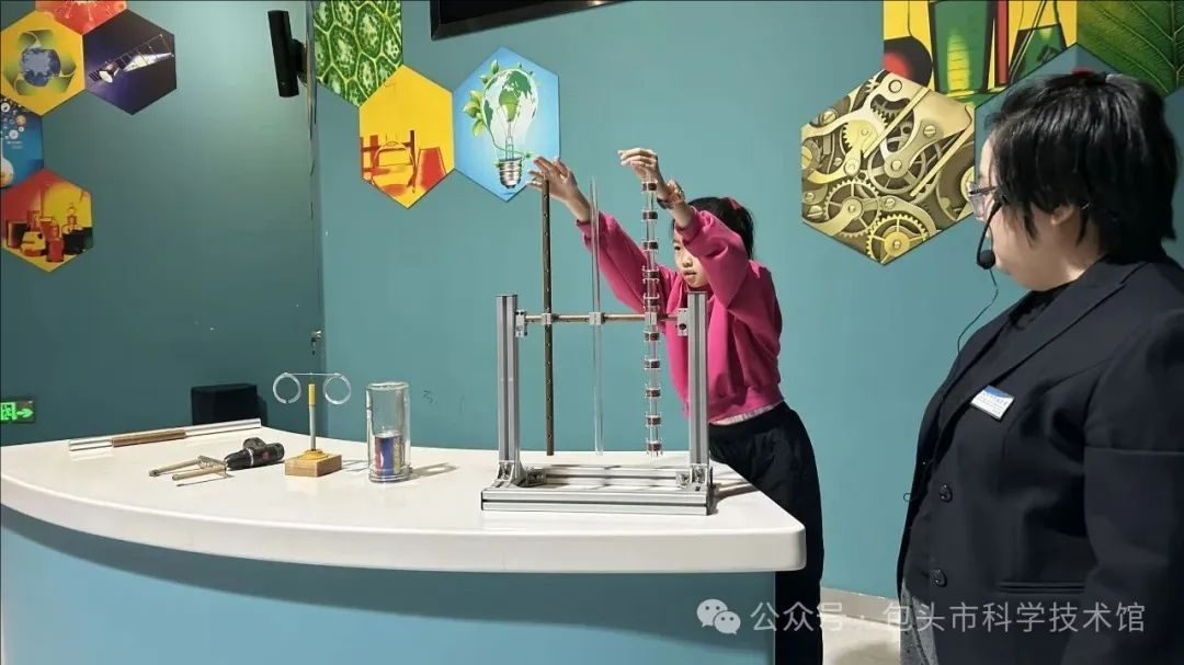 备受期待的“来去拒留环”实验更是让观众目不暇接。当辅导员老师将磁铁靠近闭合铝环时,铝环仿佛被赋予了生命,时而被“吸引”靠近,时而被“排斥”远离,精准演绎了楞次定律的核心内涵——感应电流的方向总是阻碍引起它的磁通量变化。同时,老师用通俗易懂的语言揭示了这就像磁场与铝环之间在进行一场“相互抵抗”的游戏,而这种“抵抗”本质上是能量守恒定律的必然结果。奇妙的实验现象引发观众阵阵惊呼,不少小朋友兴奋地踮起脚尖,眼睛紧紧盯着铝环,近距离观察它的运动轨迹,眼神中充满了好奇与探究。